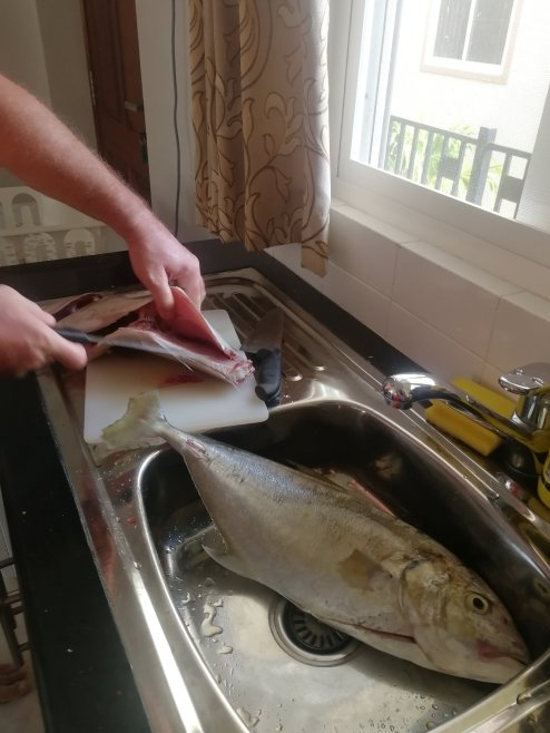 Kad smo na plaži ugledali ribara sa svežim ulovom, odmah smo odlučili da konačno koristimo kuhinju. Dve ogromne ribe za 6 eura i hrana za tri dana. Sve potrebno smo kupili i voća u izobilju.