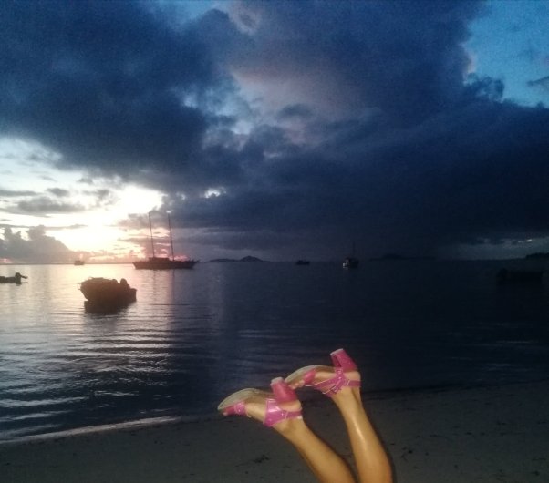 Prvog popodneva, nakon raskomiravanja, spustili smo se do najbliže plaže Anse la Mouche. Oseka i puno korala, bez ribica, učinili su da nam nije bila baš privlačna. Produžili smo ka jugu i ostali na lepoj Bay Lazare da uživamo u zalasku sunca.
