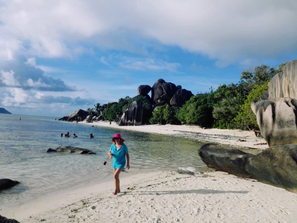 Došao je dan seobe na ostrvo La Digue. Kada sam kupovala karte, za vreme koje mi je odgovaralo nije bilo veze sa jednom kompanijom već smo morali na Praslinu da menjamo brod. Imali smo samo 15 minuta vremena za to preletanje i kad sam videla kako protiče čekiranje i ukrcavanje, pomislila sam da nema šanse da stignemo. Sve po avionskoj proceduri, uzmeš bording karte, predaš prtljag… znoj me oblio od panike. Propašće mi karte, ali hajde! Te sa Praslina za La Digue i nisu bile toliko skupe kao ove do prvog ostrva: 28 eura je povratna La dig-Praslin, jedan pravac Mahe-Praslin 50 eura za jedan sat vožnje brodom a avionom 64 (po osobi). Prilikom ukrcavanja, zamolila sam radnike na prtljagu da mi stave kofere što bliže izlazu. Stigli smo na Praslin i ja sam odjurila da čekiram nove karte a muž je čekao kofere. Sreća pa smo sve hitro završili i ukrcali se na brod. Tada sam videla da su svi opušteni i da ne kreću sve dok i zadnji putnik ne uzme prtljag. Džabe sam paničila!