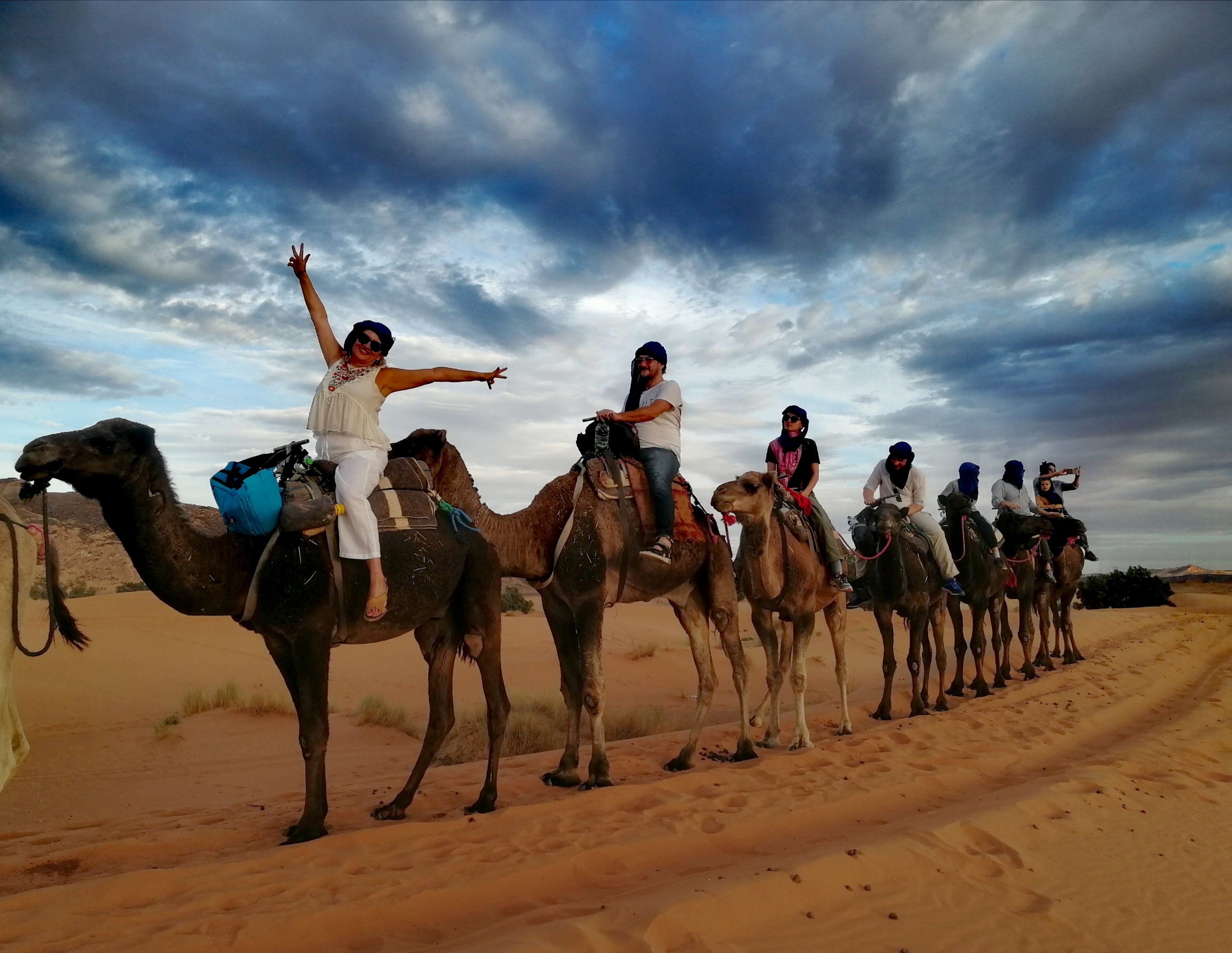Rano ujutro smo izmigoljili iz zaspalog hotela i krenuli zamagljenim obroncima planine Rif prema Irfanu. Tu smo pogledali statuu lava, rasanili se kafom i nastavili vijugavim putem koji nas je čekao. Do Merzuge je oko 7 sati vožnje. Bili smo dogovoreni da se nađemo u Merzugi u 16 sati ispred muzeja 4 × 4, sa čovekom iz agencije Camel trekking preko koje sam rezervisla spavanje u pustinji. Put je stvarno predugačak, predeli nisu nimalo fascinantni, niti imaš šta da pogledaš zanimljivo uz put. Pored stajanja za rastezanje i piće, iako smo krenuli u 7, stigli smo malo pre 16 sati. Čovek nas je odveo u hotel Nomad gde smo parkirali i pridružili se grupi koja je čekala utovar na kamile.To je bila jedna nesvakidašnja i zanimljiva iskušnja. Na leđima previsoke kamile koja se gegala onim peskom i klatarila na sve strane imao si utisak da ćeš se omaći svaki čas. Kad prevaziđeš tu neudobnost i nagon za smejanjem, počneš da uživaš u predelima. Uvek sam se pitala šta ljudi toliko lepo vide u peščanim dinama. Čini ti se da je to sve jednobojno ali ti se stvarno samo čini. Te nijanse i oblačno vreme koje nam je ulepšalo popodne su neopisive. U momentu kad je provirilo sunce, imali smo genijalne senke. U pauzi smo jurcali po dinama, valjali se, kotrljali sve dok jedan od naših iz grupe nije shvatio da je izgubio telefon. Kakav je to tek cirkus bio😂 Neki su se bacili u pomoć i potragu ali delovalo je kao nemoguća misija jer je čovek isključio zvuk! Već su nas zvali iz kampa da vide zašto kasnimo i odustali su od potrage te smo nastavili jahanje. Kamp je prava orijentalna bajka, luksuzni šatori sa krevetima sa baldahinima i lepim kupatilima. Večera nam je servirana uz berbersku muziku i kasnije smo nastavili zabavu uz vatru i pevanje uz bubnjeve. U cik zore tj. oko pola 8 su nas probudili da bi uživali u izlasku sunca. Prelep prizor. Čovek koji je juče izgubio telefon, obavestio nas je da je u rano jutro sa vodičima išao nazad, poneli su grabulje i pronašli telefon. Neverovatno! Nakon doručka smo imali opciju da se vratimo nazad na kamilama ili džipovima. Mi smo izabrali ovo drugo i bili potpuno oduševljeni. Muž i ja smo stajali u gepeku čvrsto se držeći i vrištali od oduševljenja jer je džip skakao kao podivljali bik. Rastadosmo se sa pustinjom i krenusmo u novi dan.Link jednog od jeftinijih kampova Luxuri maktoub
