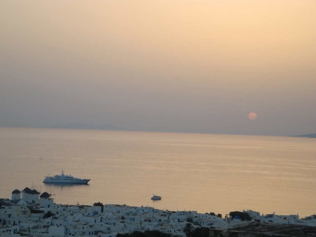 Elem, sletesmo mi na taj famozni Mikonos. Na aerodromu nas je dočekao vlasnik apartmana. Rezervisala sam 2 noći u mestu u Germanos studijima i 3 na plaži Psarou. Na Kikladima je običaj da vas vlasnici apartmana dočekaju i voze u smeštaj. Divota! Iako smo u prvom smeštaju bili samo 2 noći, vlasnik nas je sačekao i posle dva dana odvezao opet na aerodrom ( tada smo imali rezervisan auto koji je uvek jeftinije rentirati na aerodromu). Imali smo divan studio na brdašcu iznad mesta i pogled je bio neverovatan. Naročito su me očarali zalasci sunca i pun mesec pod kojima su se iscrtavale ogromne križarke ukotvljene u zalivu.