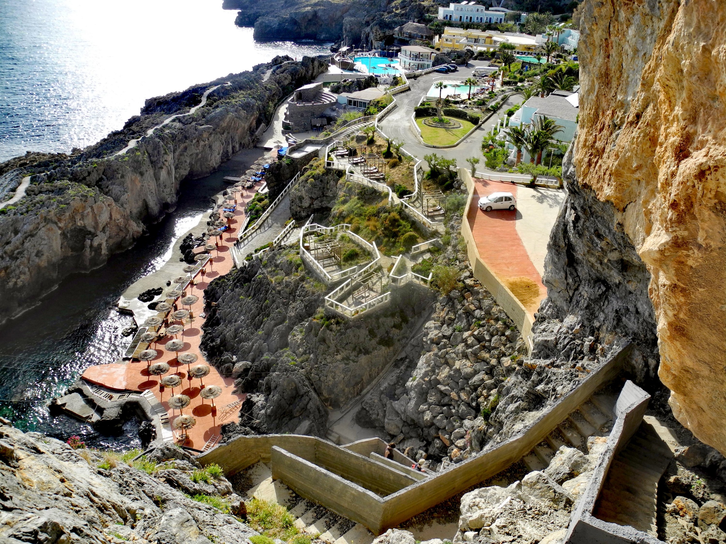 Od Sfakie smo krenuli južnom obalom pored Frangokastela, jedne od mnogobrojnih tvrđava. Divna plaža na Libijskom moru je ispod njega a unutar i nema ništa posebno da se vidi. Sledeća prelepa stanica je stena Kalipso, sa koje je nimfa Kalipso zavodila Odiseja. Tu se nalazi predivan hotel Kalipso village u kome smo odseli. Za svaku preporuku je sa svojim brojnim sadržajima i prekrasnom pozicijom.