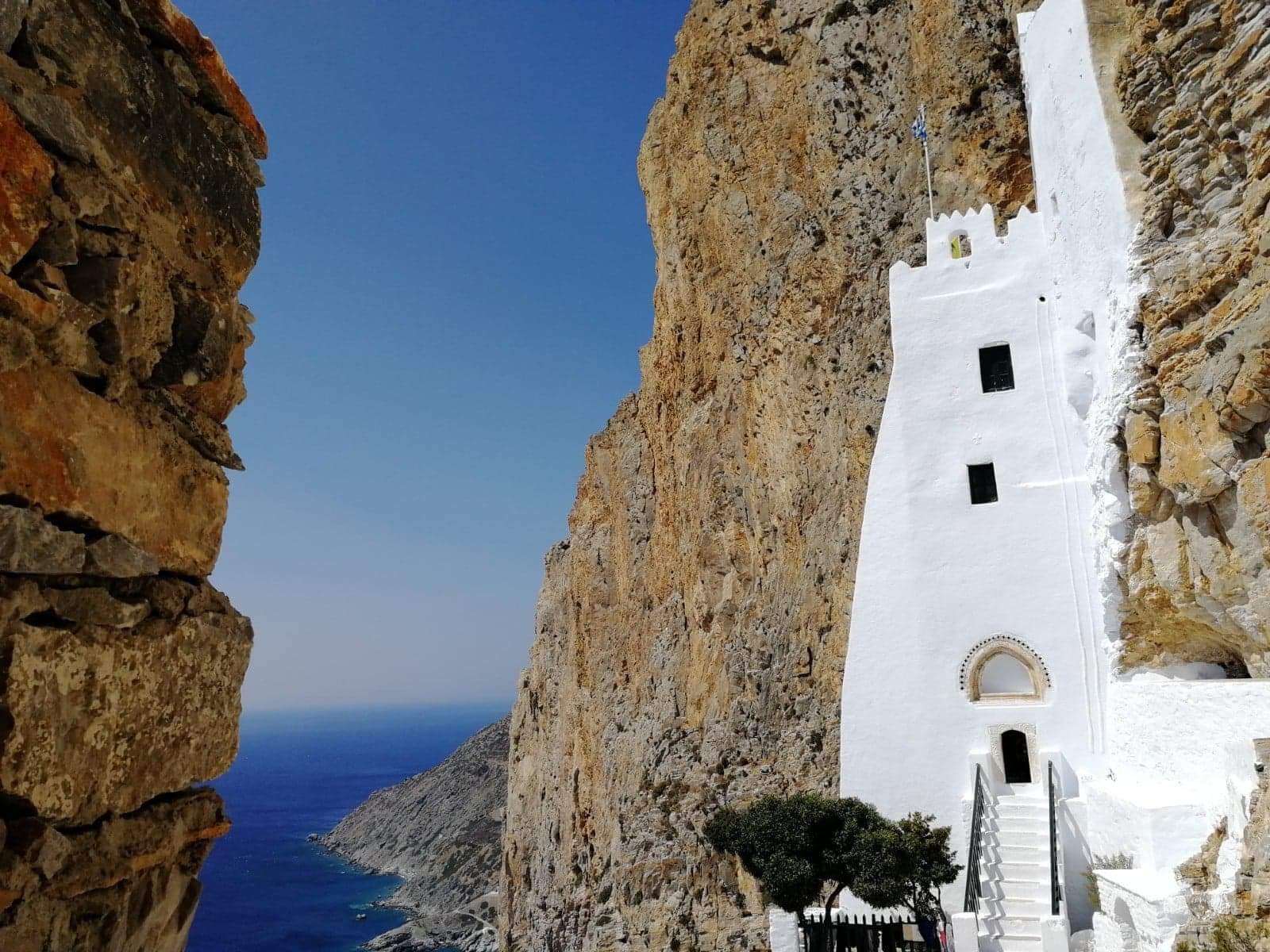 Pre odlaska u odličan hotel Galaxi, morali smo da posetimo simbol Amorgosa, čuveni manastir Hozoviotica. Posvećen je prikazanju device Marije i sagrađen na steni planine Profitis Ilija. Belo čudo koje se vidi sa mora izgleda kao da je prilepljeno za liticu. Za njega kažu da je manastir iz jedne stene i cela građevina je iz jedne fasade. Ima osam spratova i pravi je mali lavirint od isposničkih ćelija koje su uklesane u stenu a u tom jedva pet metara širokom prostoru vijugaju stepenice u visinu od 40 metara. Prema tradiciji manastir je osnovao Vizantijski car Aleksije Komnenos tokom perioda ikonoklazma kada je pronađena ikona Bogorodice koju je bacila žena iz Hozove u Palestini kako bi je spasila. Ona je nekim čudom dospela na Amorgos.
