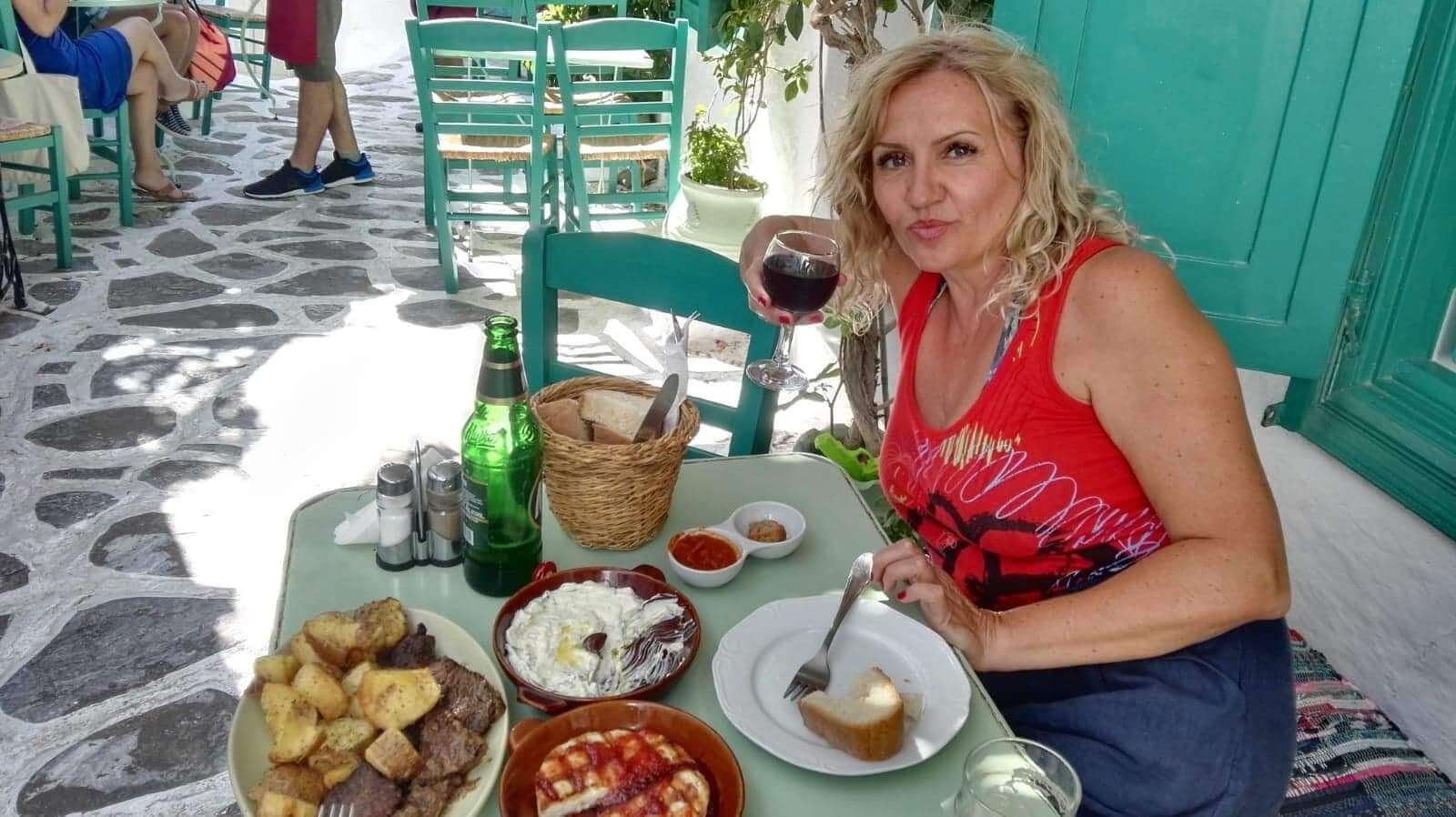 Prizemljite se u nekoj taverni i prepustite kormilo čulu ukusa. Seli smo u simpatični, pretrpani Tranzistoraki i naručili nešto što nikad nismo jeli. Dobili smo predjelo od sira sa džemom od paradajza i kserotiganja-pržene pite punjene belom repom i komoračem. Pobili smo se oko onog sira koliko je dobar i nesvakidašnji. Specijalitet na ostrvu je teški ovčji sir čuvan u maslinovom ulju, ladotiri. Pored morskih specijaliteta, koza kuvana sa krompirima je ostrvsko omiljeno jelo. Još jedan novitet koji smo tu probali je rakomelo. Kada su mi to ponudili, bila sam šokirana da po onoj vrućini pijem kuvanu rakiju sa medom. Ok, prihvatila sam predlog i oduševljeno se narednih dana nalivala rakomelom.