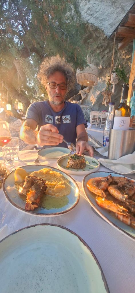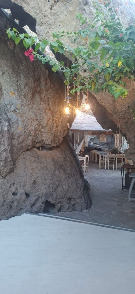 Odosmo da predahnemo u božanstveni restoran u pećini i kad smo očekivali da će nas odrati zbog one fensi atmosfere sa pogledom na Atos, rastopismo se od šoka koliko je sve jeftino. Ali eto naleteli smo na taj Barbunaki pošteni dok su nam u elegantnoj Mirini tražili 40 eura za majcu. Povikasmo da smo na Rodosu dali 20€ za takvu istu marku. Ali ovo je Limnos! Kaze nam gospodja a mi se zgledasmo zblanuto: what a fuck, šta time misliš bona, ko je Rodos a ko Limnos. Eto i oni udareni u glavu pa nam bolest prenesoše.