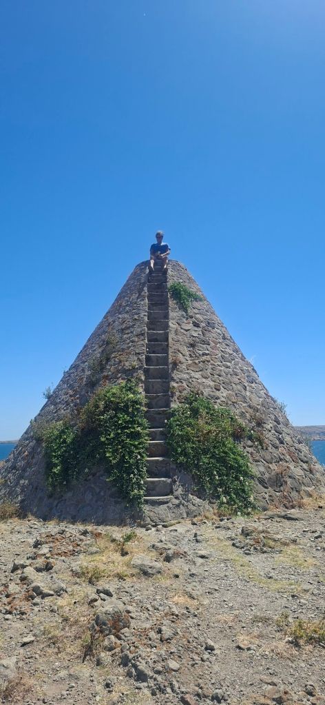 Najednom smo se obreli u pustinji kao da smo u Egiptu a ne na Egeju, raztandrkasmo auto načisto po nemogućim kaldrmama da vidimo kamena bela jaja dinosaurusa. Geološke formacije, kako su ih ovde krstili a za krštenje si morao da se penješ u nebesa izmedju rupičastih brda gde se sakrila crkva bez krova. I na kraju su nas presrele kubistične piramide za koje tvrde da su ih napravili pre 7000 godina ljudi koji su živeli tu pre Helena i govorili pelazgijskim jezikom.